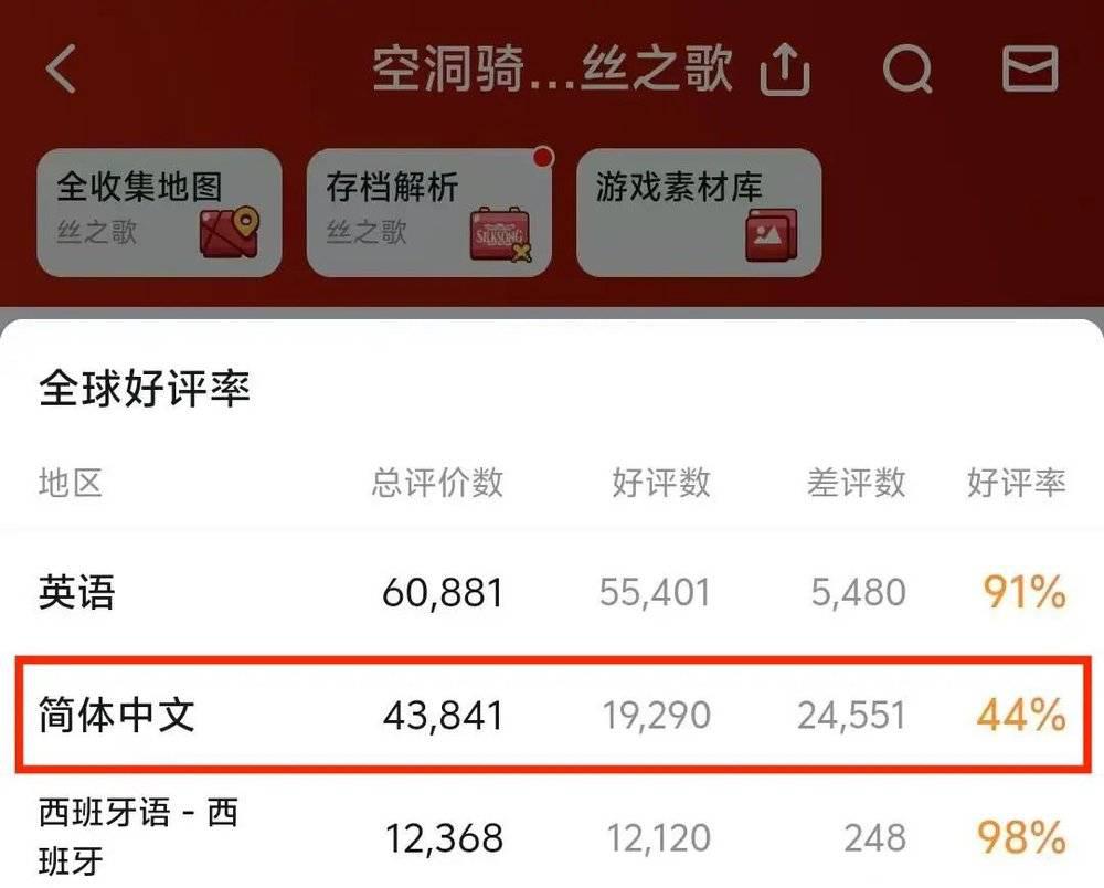 上线第一周,《空洞骑士:丝之歌》的简中区好评率跌破 50%,是主流地区中评价最低的,比倒数第二的日语地区还要低 20 个百分点。