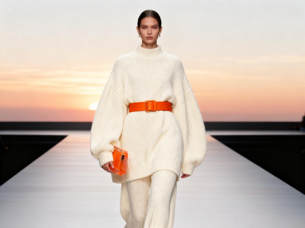 提示词:runway model, oversized cream-white knitwear set, wide silhouette, bright Cosmic Orange leather belt, semi-transparent orange clutch bag, stage with soft sunrise lighting, futuristic minimalist runway