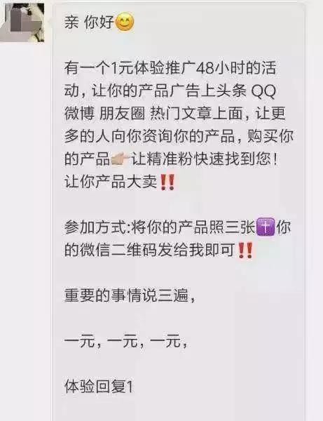 诈骗手法:比如一些微商小白刚入手一堆货后,发了几十条pyq后都没人买,内心很是焦虑。这正心急如焚呢,就有好心人雪中送炭送来推广平台,一元就能免费体验效果。