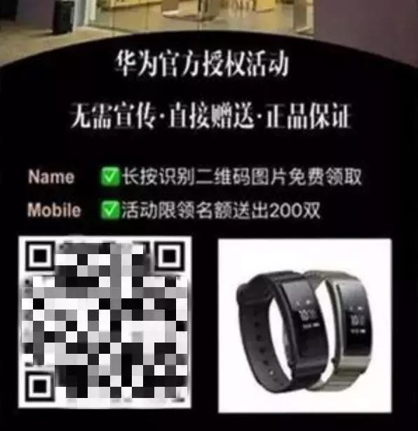 诈骗手法:以商家活动宣传,粉丝回馈为借口,诱导转发获赠免费礼品,以骗取邮费。比如一条送华为智能手环(价值两块的仿冒品)的信息在微信群疯狂传播。