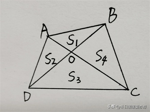三角形ABO与三角形AOD的高一样,所以面积之比就是底之比,同理三角形BOC和三角形COD的面积之比也是底之比,即S1:S2=OB:OD,S4:S3=OB:OD,所以S1:S2=S4:S3,也即是S1×S3=S2×S4。