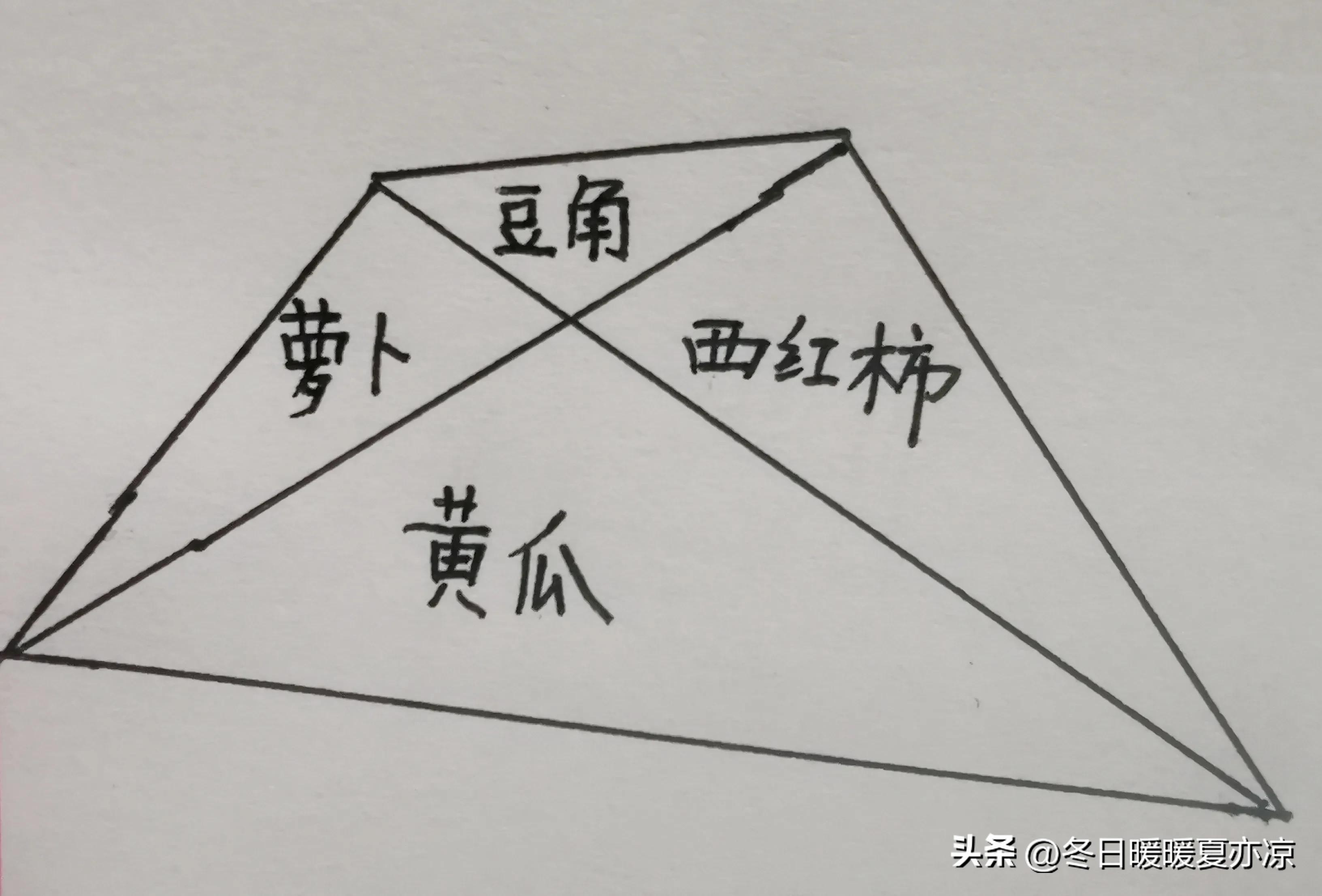 题目:如图,李奶奶有一块外轮廓是四边形的菜地,她沿着对角线把这块菜地分成了4部分,分别种上了豆角、萝卜、黄瓜和西红柿。豆角地的面积是8平方米,萝卜地的面积是10平方米,黄瓜地的面积是12平方米,则西红柿地的面积是多少平方米?这块菜地的总面积是多少?