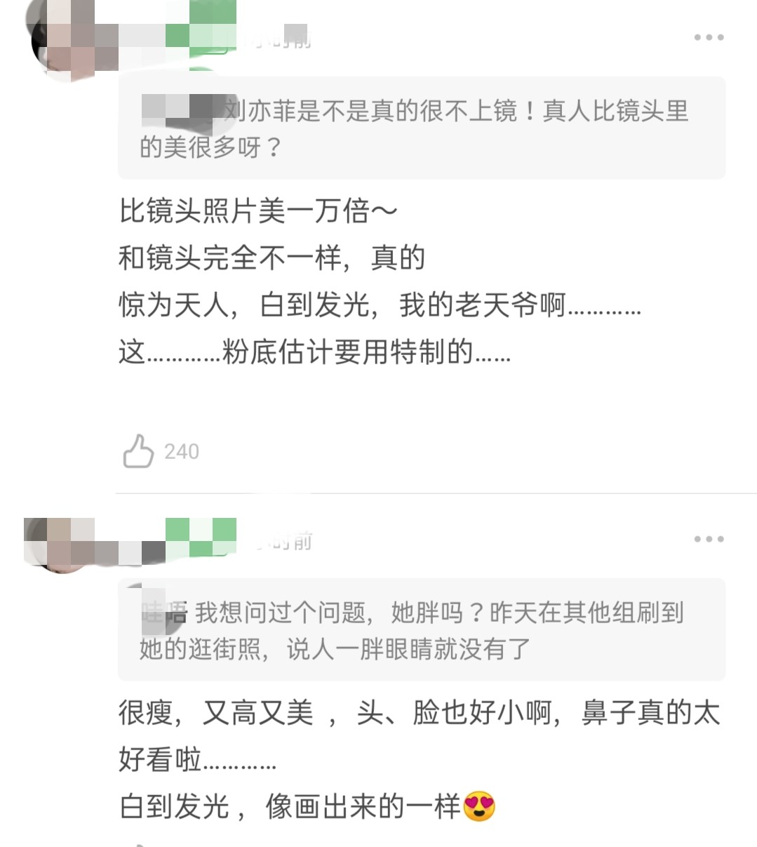 并且网友还评价刘亦菲比比镜头上还美,大呼"镜头照片美一万倍~和镜头完全不一样,真的,惊为天人,白到发光,我的老天爷啊",称赞她又高又瘦,脸也很小。