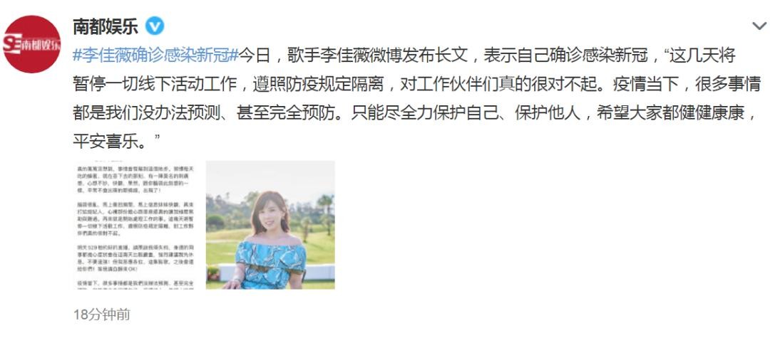 歌手李佳薇确诊感染新冠