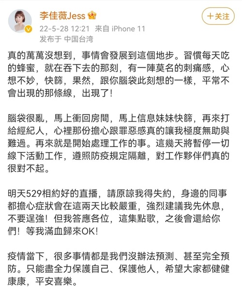 今日(5月28日),歌手李佳薇微博发布长文,表示自己确诊感染新冠。她表示这几天将暂停一切线下活动工作,遵照防疫规定隔离,对工作伙伴们真的很对不起。疫情当下,很多事情都是我们没办法预测、甚至完全预防。只能尽全力保护自己、保护他人,希望大家都健健康康,平安喜乐。