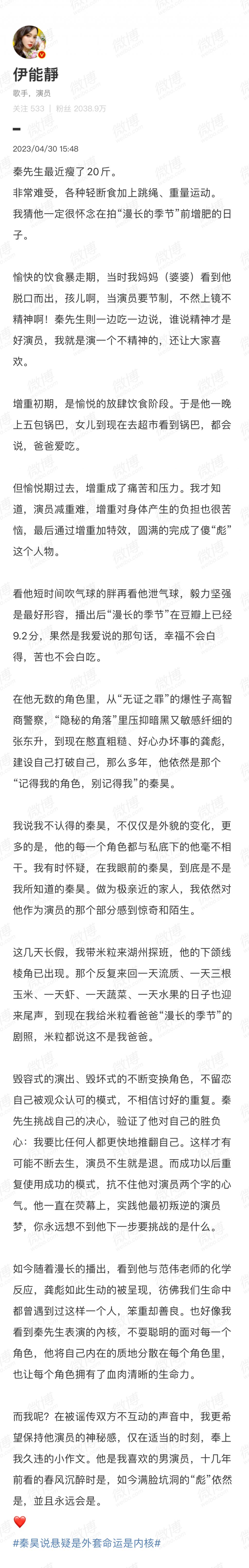 演这部戏付出也很多,秦昊的太太伊能静,写小作文表扬先生是如何敬业。