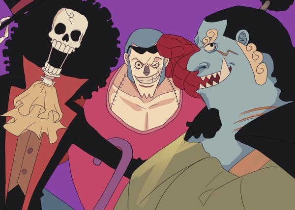 下面这张是草帽团的第八到第十位伙伴。弗兰奇在司法岛与草帽团有了情谊,布鲁克是音乐家又是骨头,所以路飞也是一眼相中。老甚平是因为顶上战争和鱼人岛的情谊加入的。这几位在草帽团里的战斗力也都不错,现在都对战上了飞六胞。