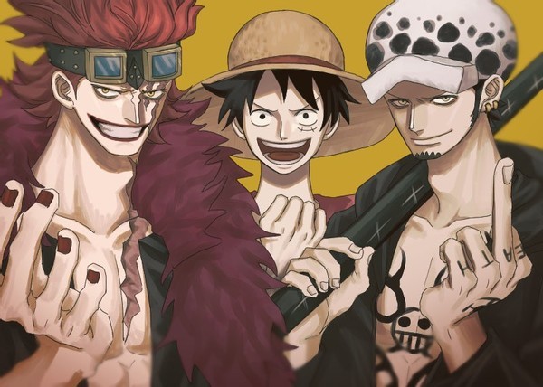 三大船长这张也是路飞最矮,站得最后。罗比着自己的标准手势,路飞自信地捏着拳头,基德看起来最狂。这些神态和手势都彰显了他们的性格。