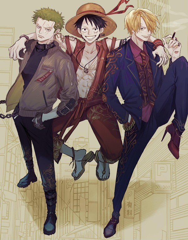 三大主力这张的亮点很多。山治穿了一双高跟鞋,这鞋踢人应该很痛吧。索大在里面穿了紧身衣,总给人一种会打双截棍的错觉。路飞看起来比较正常,但脸部也美型了不少。