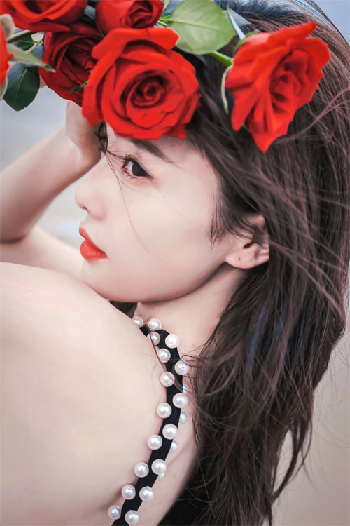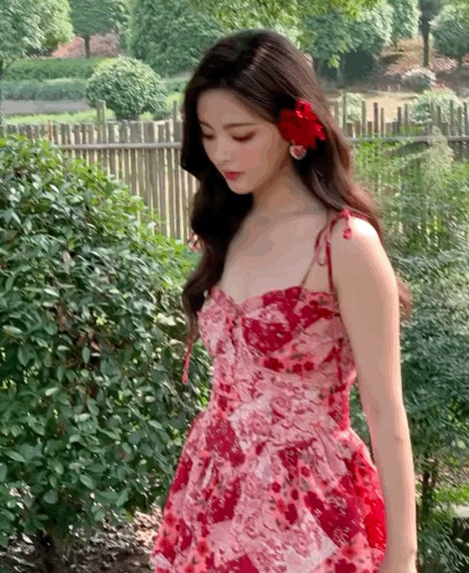她身穿红色吊带裙,披散着一头秀发,头发的一侧簪着一朵红色的花朵。