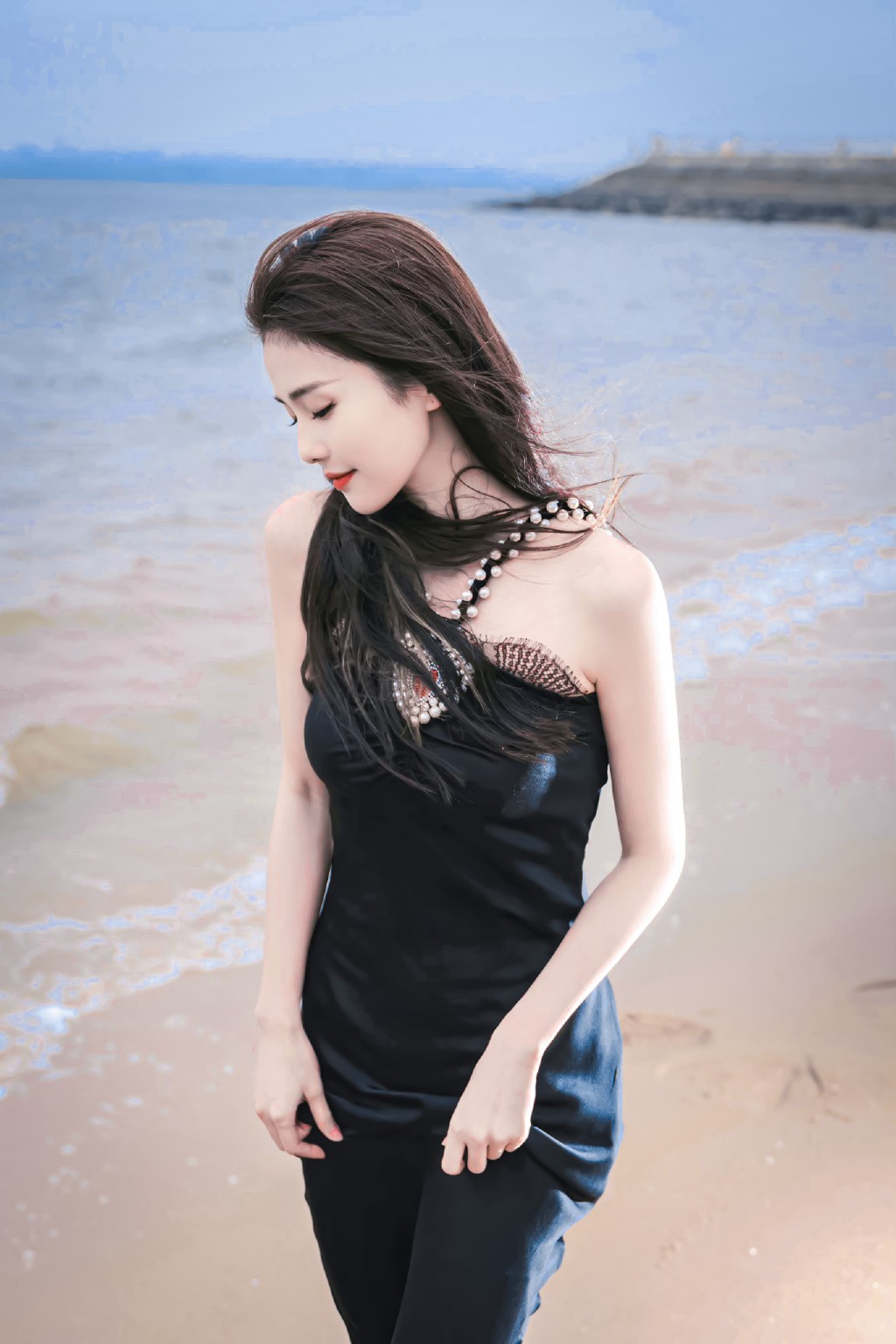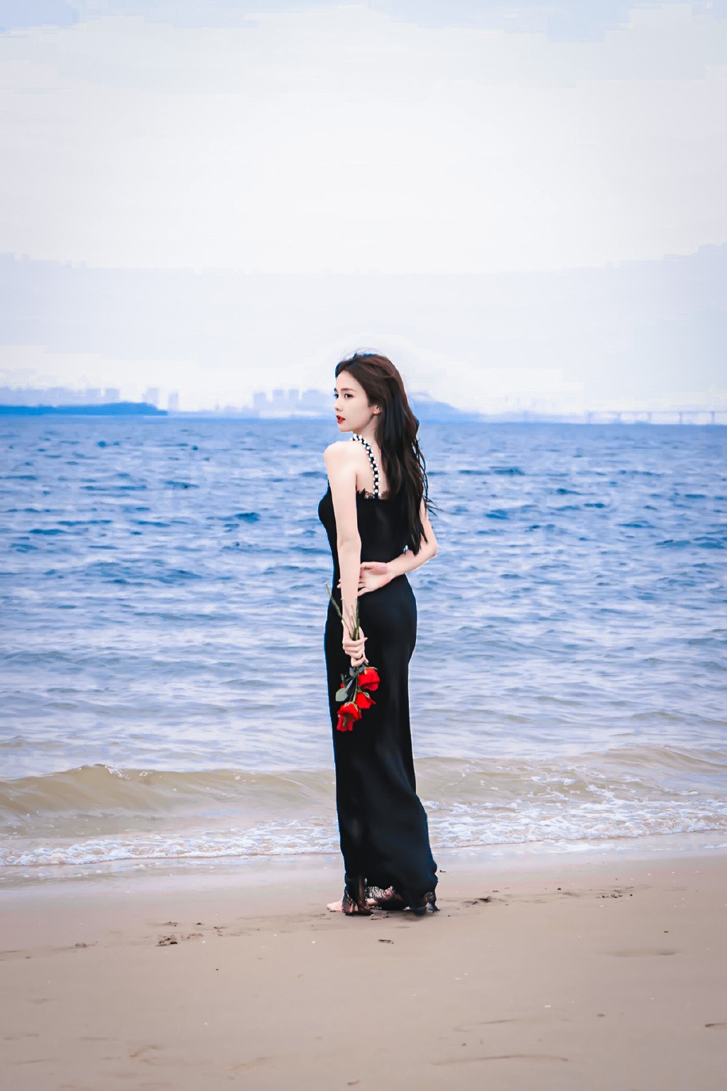 她伫立在蓝色的大海边,黑色长裙勾勒出曼妙身材,长发在风中轻轻飞舞,雪肤花貌,美得像一位落入凡尘的仙女。