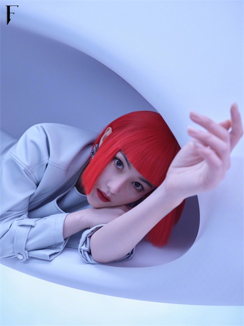 她顶着一头红色短发,身穿银色套装,五官明艳,又美又飒。