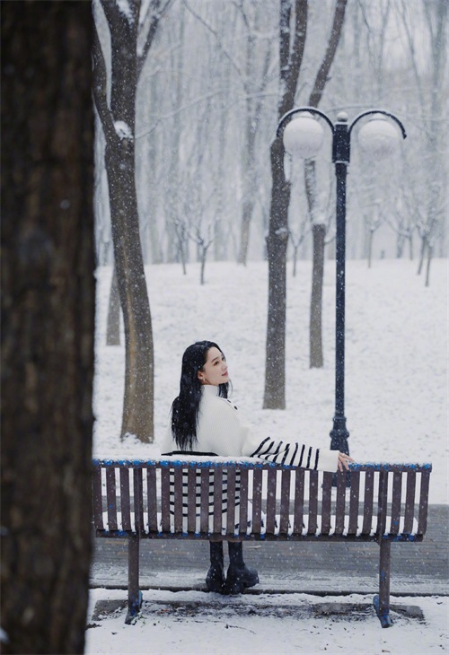 她身穿黑白条纹毛衣,长发披肩,在雪中浅笑,眉眼弯弯,干净美好,如同雪中的精灵。