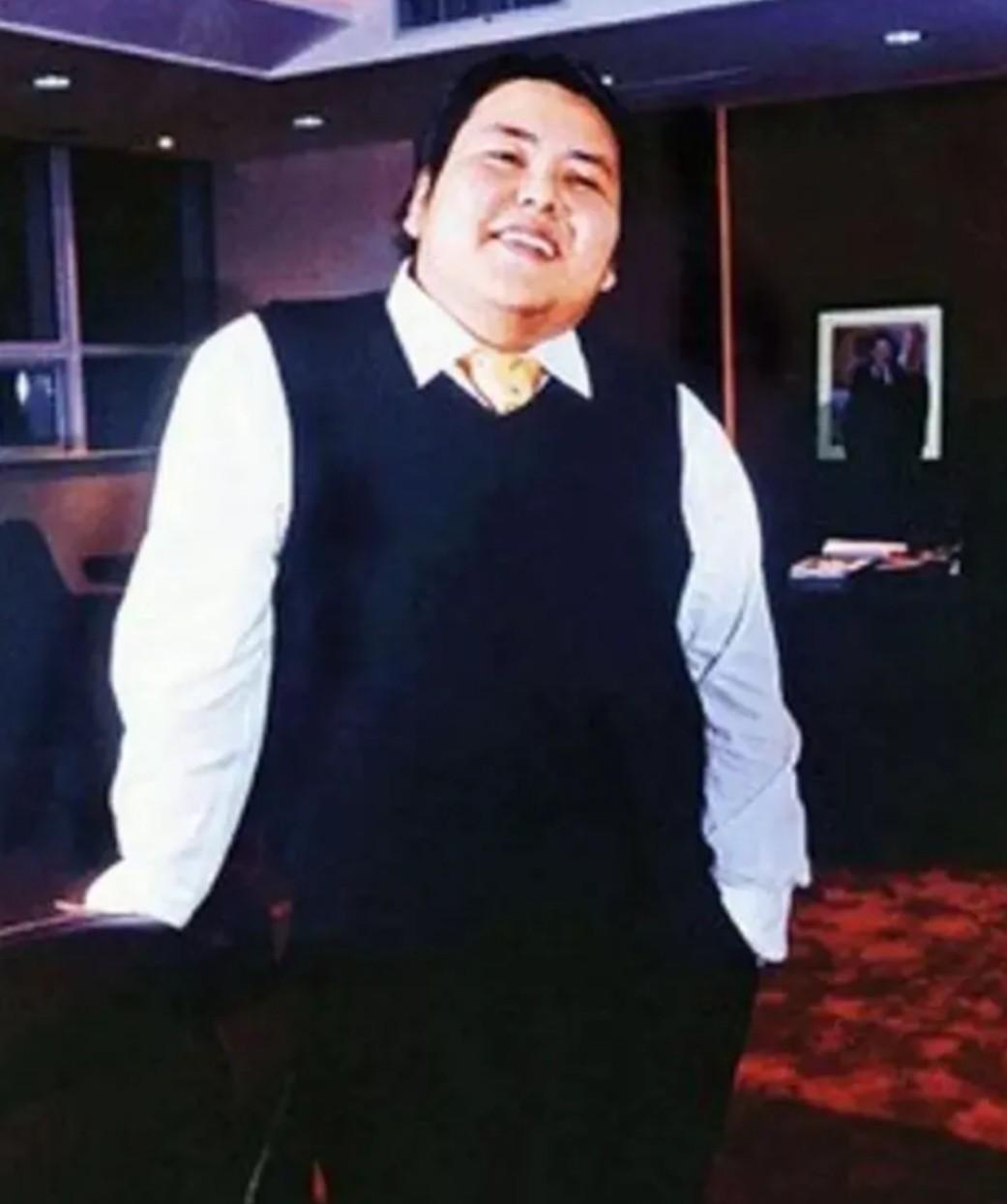 油腻的短发,胖胖的脸颊,一个黑框眼镜,长时间穿着一身看起来很臃肿的西装,让人第一眼看上去不像是一个有钱人的样子。