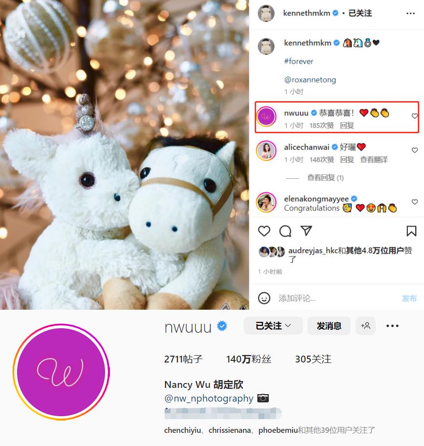 马国明与汤洛雯为了让所有人都能及时看到婚讯,在不同的社交平台都有发布消息,人缘甚好的他们,得到了一众明星的祝福,包括陈炜、江美仪、胡杏儿、杨怡等。