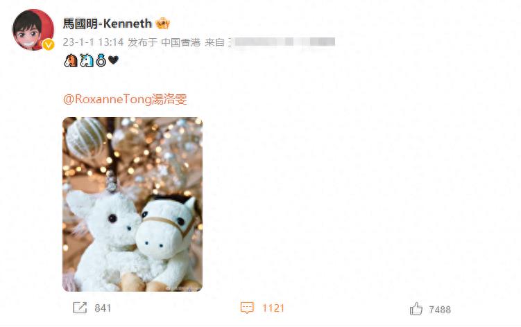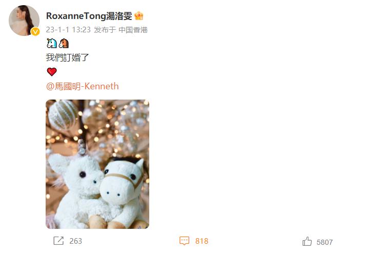 马国明早前受访时透露有意2023年与女友汤洛雯结婚,他果然言出必行,趁着元旦,他卡点13点14分发文宣布求婚成功,并晒出了独角兽及小马定情信物。
