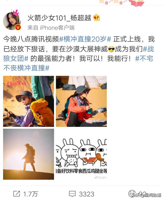 去微博一探究竟才知道,原来是《横冲直撞20岁》这一档由腾讯视频出品的青春探险真人秀节目要播出了,而参与人员就是火箭少女101团队,当然,杨超越也是其中的一位。