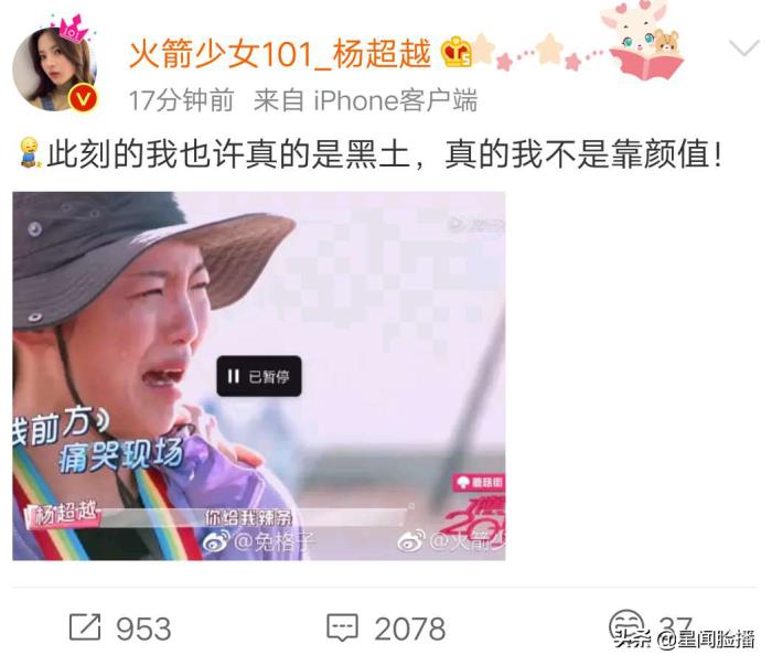 节目在晚上八点,由腾讯视频首播后,收到了广泛的好评。而火箭少女101中的杨超越,也在和大家同步观看。在观看的途中,小仙女杨超越还发布了一条微博:此刻的我也许是真正的黑土,真的我不是靠颜值!