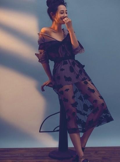 黑色透视薄纱长裙里面内搭一件灰色衬衫裙,裙子长度非常短,露出细白双腿,外面有着薄纱覆盖,更加诱人!宽松的衬衫领口拉下,露出肩膀线条魅惑动人!