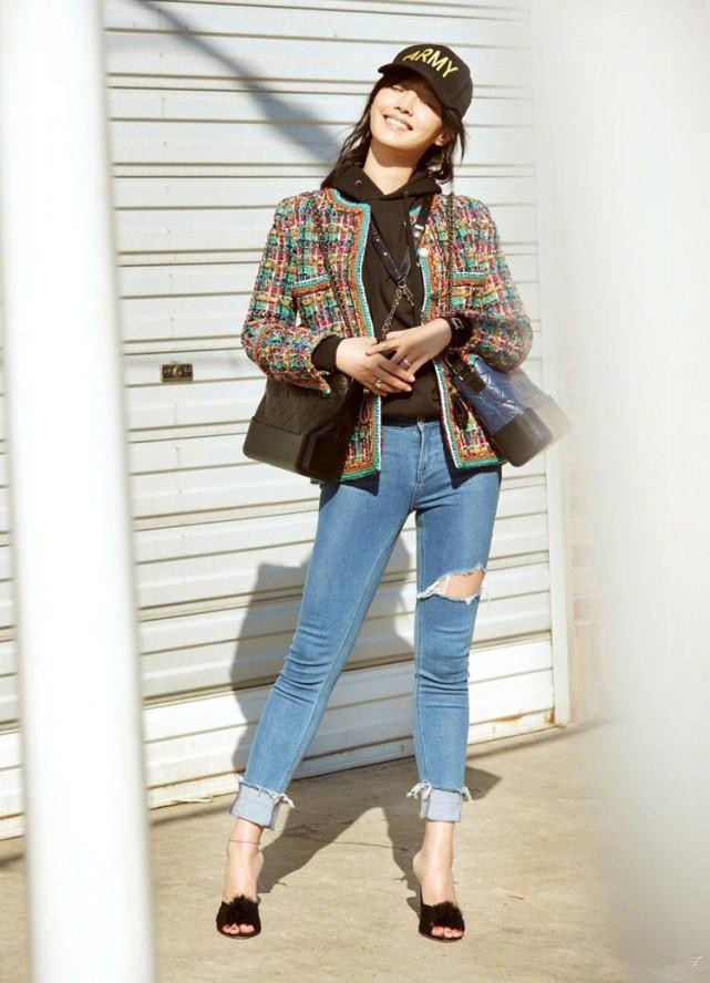 如今的白百何现身活动,身穿一件纯黑色连帽卫衣,外面叠穿一件彩色格纹外套,充满着青春时尚的感觉,下身搭配一条浅蓝色破洞牛仔裤,搭配黑色高跟,休闲十足!