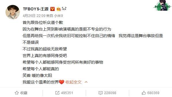 王源唱自己原创歌曲唱到大哭,发文致歉后,获张杰梁博等明星支持