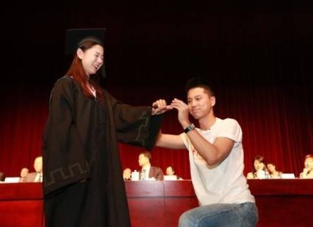 演讲快结束时,王雷手捧鲜花跑上了台,对李小萌单膝下跪,举起戒指:“在中戏的校园里我成就了学业,也希望在中戏今天这个特殊的舞台上收获自己的爱情,小萌,嫁给我吧!”