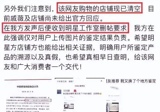 据了解,该机构曾表示,发声后收到了明星工作室的删帖要求,同时鉴定机构注意到,该网友购物的店铺现已清空。