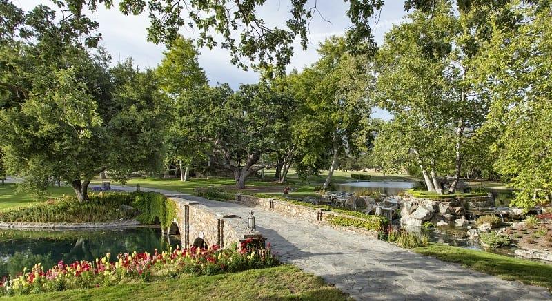位于 Sycamore Valley Ranch(前身为 Neverland Ranch)的湖上的小桥。
