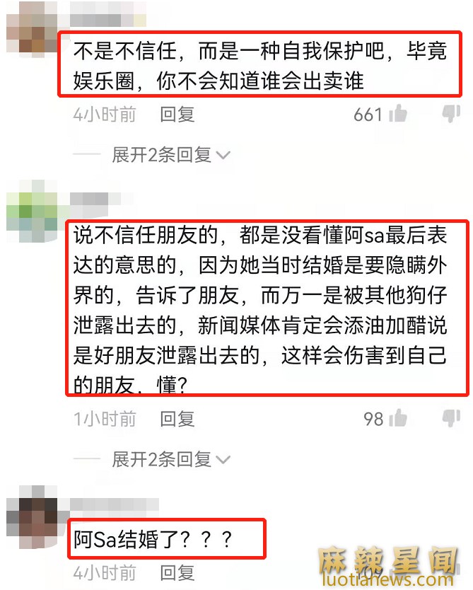 阿SA最近在一档节目中提到了和郑中基隐婚的一些事情,袁咏仪问阿SA当时她和郑中基两人秘密结婚时自己最亲的姐妹知不知道,而阿SA回应称没有告诉任何姐妹,甚至连阿娇都说阿SA结婚自己也不知道,容祖儿也表示并不知情,真没想到这几位明星关系那么亲密亲近连阿SA结婚的事情都不知道,可见阿SA结婚被保密的有多么隐蔽。现场气氛突然变得非常的尴尬,其他的几个明星都是一脸的不可置信,阿SA在节目中也解释了当时没有告诉几位姐妹的原因。