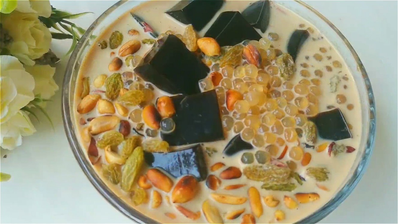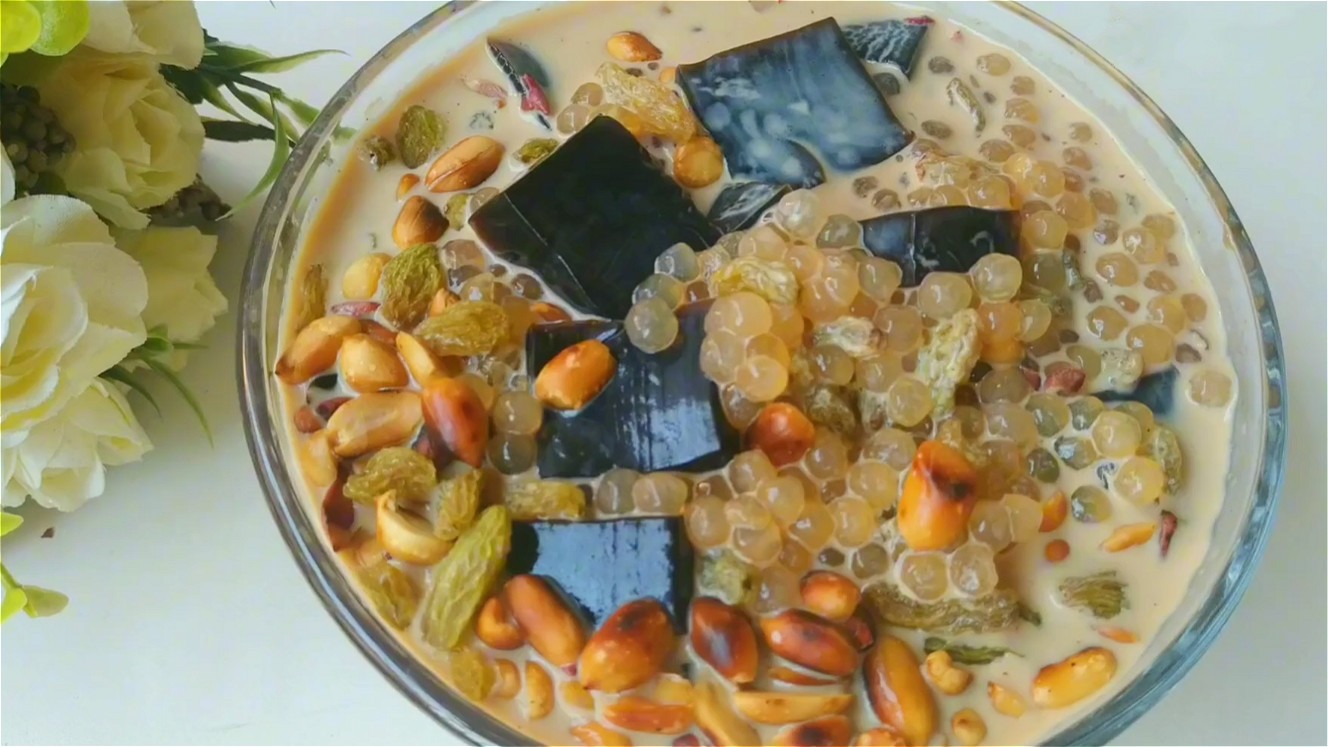 黑凉粉30克,白糖适量,西米适量,茶叶适量,纯牛奶1瓶,花生葡萄干