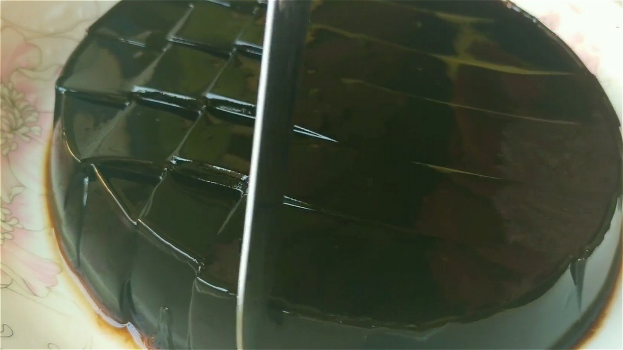 11.凉粉这把也凝固成块了,把凉粉倒到干净的碟中,再把他切成自己喜欢的块状。