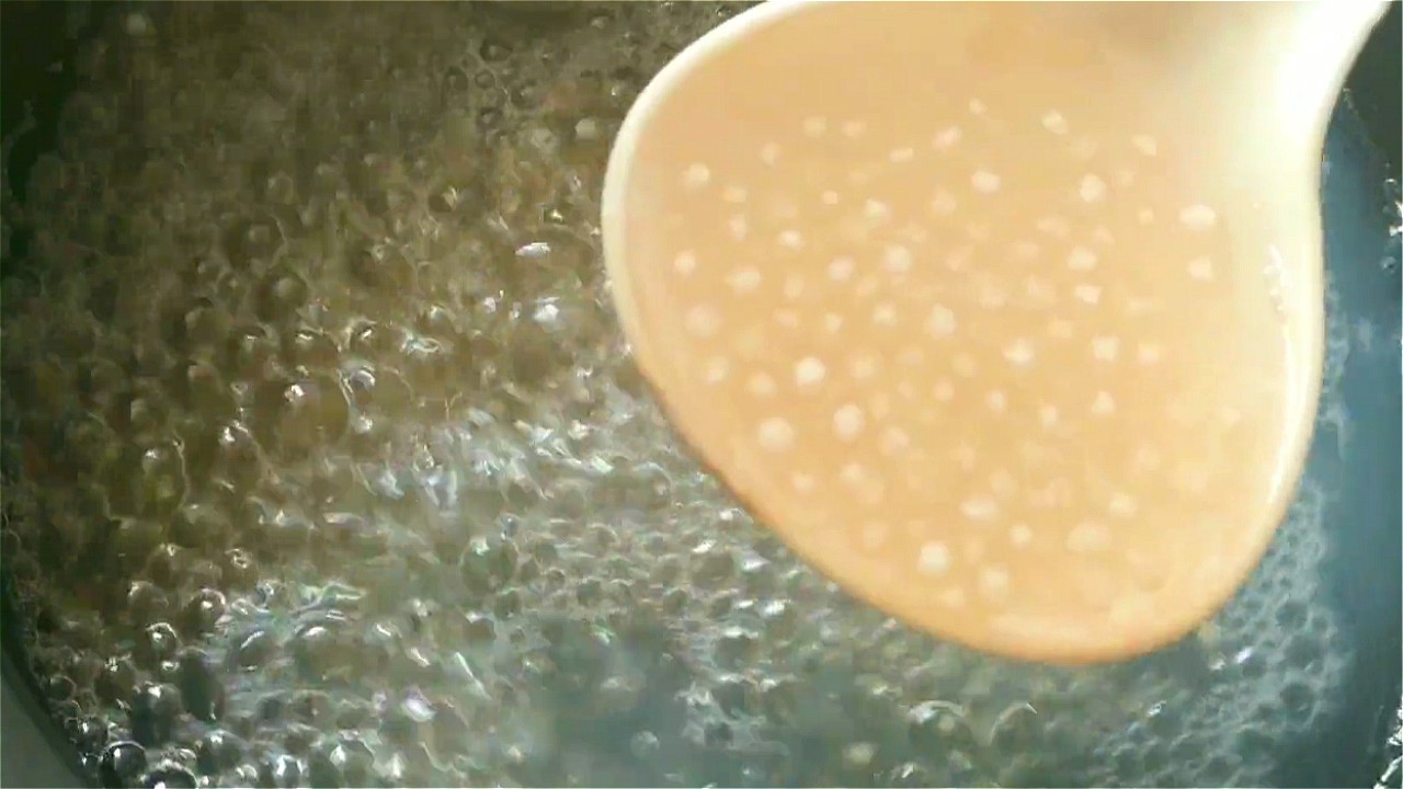 5.等待途中可以煮西米了,开水下锅,煮至半透明状态关火。