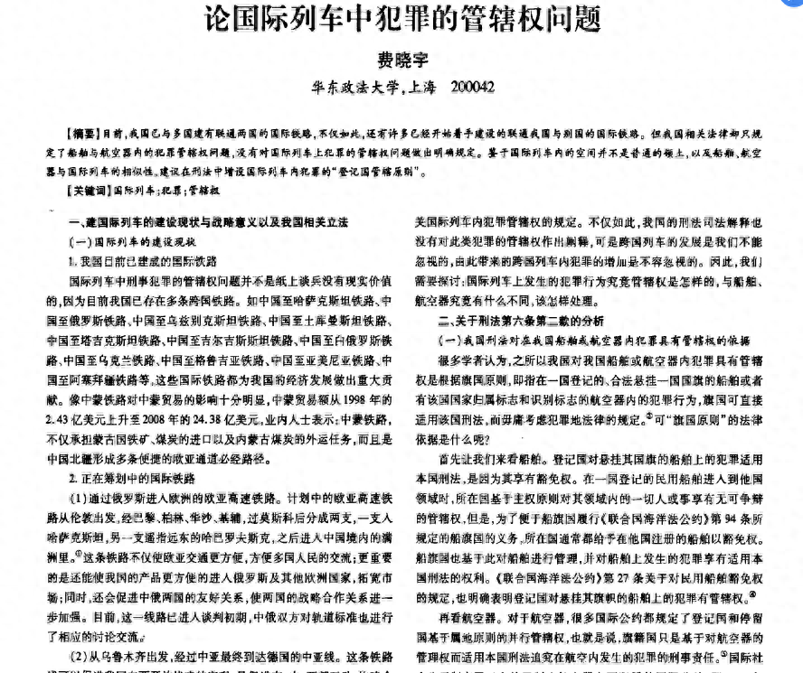 关于这个问题,华东政法大学的费晓宇发表过这样一篇文章,即“论国际列车中犯罪的管辖权问题”,他提出了我国刑法就这一问题做出的相关规定和论说。