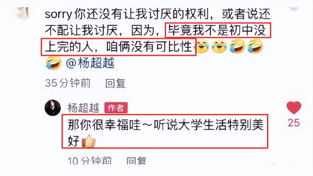 面对这条再直接不过的黑评,杨超越并没有恼羞成怒,而是很温和地回复道:“那你很幸福哇!听说大学生活特别美好。”