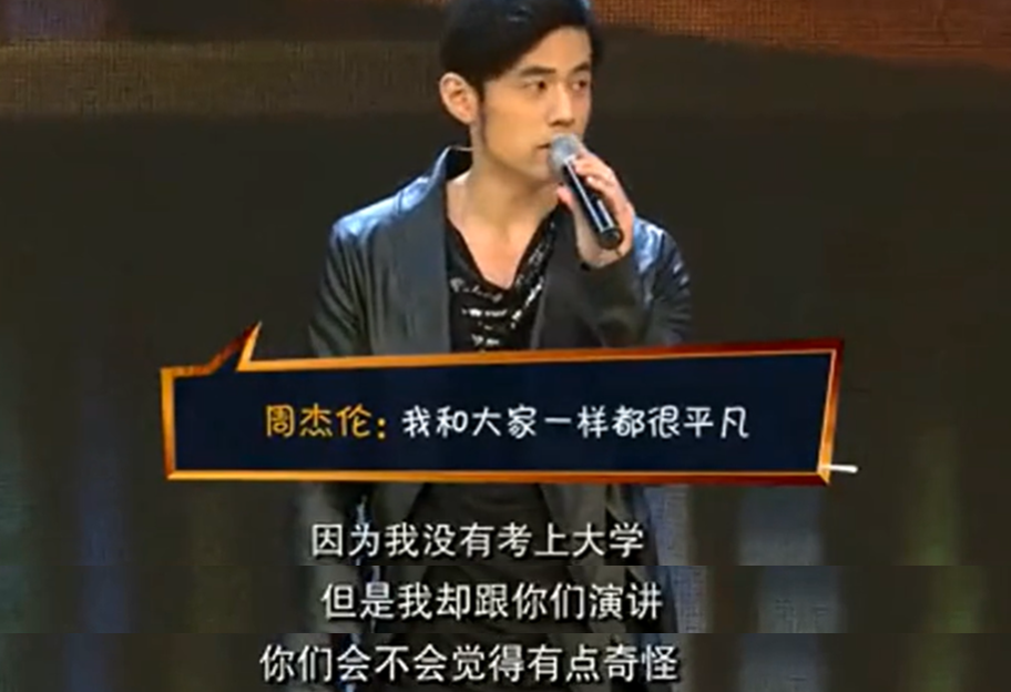 2013年,周杰伦在《开讲啦》节目中演讲,开场时他调侃道:“我没考上大学,却在这里跟你们演讲,你们会不会觉得很奇怪?”