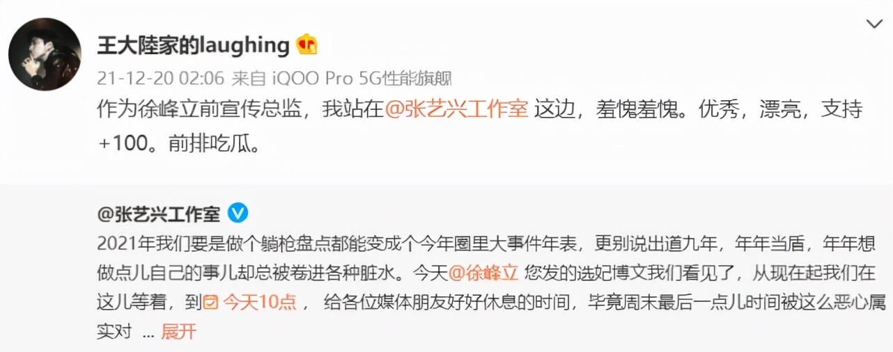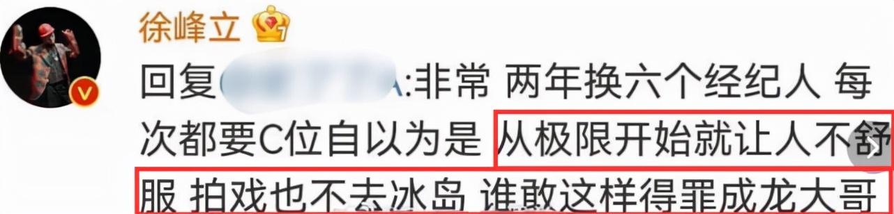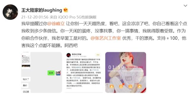 徐峰立暂时没有公开回应,不过徐峰立身边人却发声回应了,该博主自称是徐峰立的前宣传总监,表态站在张艺兴这边,还表示此前曾提醒过徐峰立不要一天天蹭热度,结果凉了吧,而他也因为徐峰立的事深夜收到了很多条信息,他也早已罢工,对于张艺兴的行为,这位前总监还表示干得漂亮,给予100个支持。