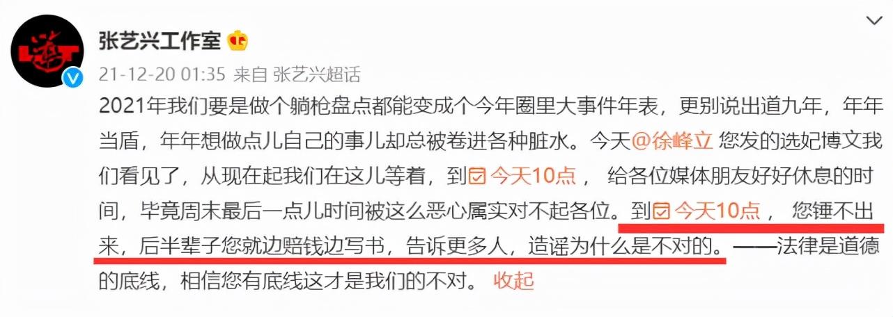 针对徐峰立的种种爆料,张艺兴工作室并没有保持沉默,19日凌晨1点35分紧急发声澄清,就徐峰立的爆料完全是造谣,张艺兴工作室还下场手撕徐峰立,如果今天10点拿不出实锤,后半辈子就边赔钱边写书,告诉更多人,造谣为什么是不对的。