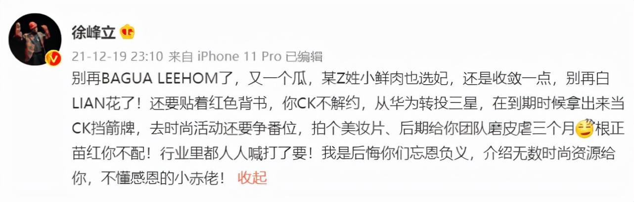 那么徐峰立爆料了什么呢?他在文中提到,某Z姓小鲜肉也选妃,给出的提示有“CK代言、华为转投三星”这两点直接对应了张艺兴,他还在评论区特意翻牌了询问他是不是张艺兴的留言,网友也直言,就差报身份证了,这个Z姓小鲜肉内涵的就是张艺兴。