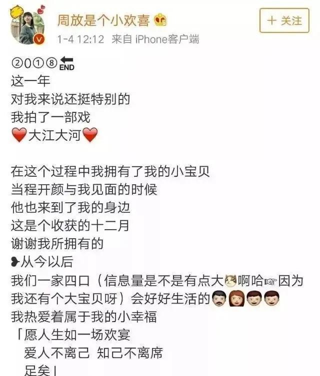 2019年1月4日,周放又发表微博告诉大家,自己是在拍《大江大河》的时候,已经生下了二胎,如今是一家4口人。