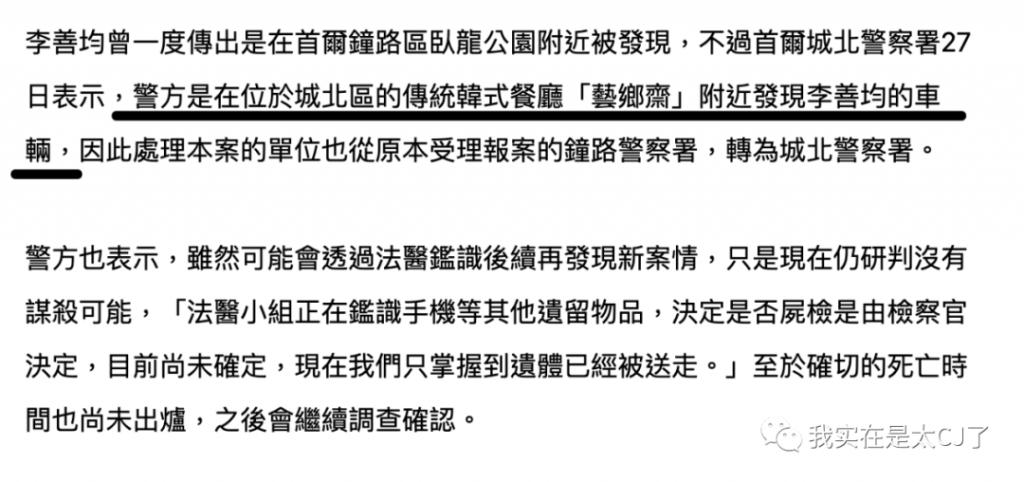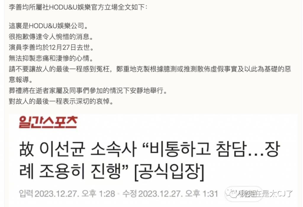 虽然经纪公司的官方立场已经反复强调 " 为了不让故人的最后一程感到冤枉,请郑重地克制根据臆测或推测散布虚假事实及以此为基础的恶意报道 ",但民间对李善均之死却没停止过揣度。毕竟这两个月来的新闻连载一路追下来,可疑点真的太多了 ……