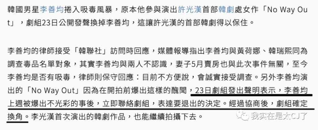 而本来要和许光汉共演的剧集《No Way Out》也因为这次风波而被李善均主动请辞,改由赵震雄顶替,这或许也要付出一些费用。