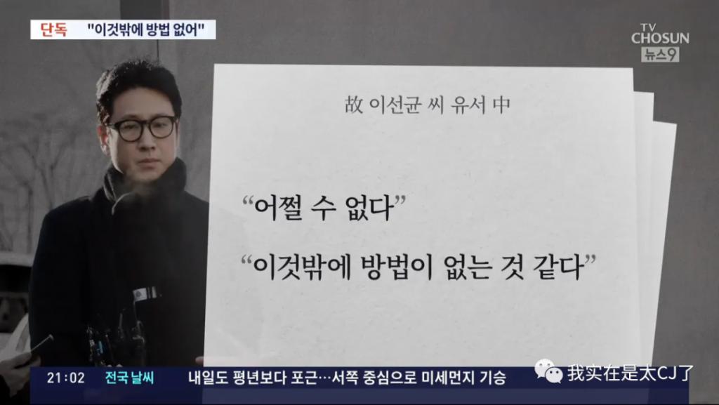 据媒体爆料,他留给妻子全慧珍最后的话是," 没办法,除此之外别无他法 ",而对公司说的抱歉是 " 电影和广告代言违约金太高了 "。