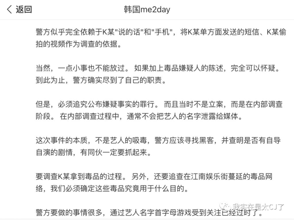 所以哪怕李善均这边看着间接证据还挺多,D 社那篇报道的论调始终建立在 " 无论是李善均被勒索还是权志龙被指控都是 A 某自导自演的一出大戏 " 上面,认为警方单凭 A 某的口供和手机内容来调查艺人有没有吸毒这件事办得就很潦草,有点太想立大功了。