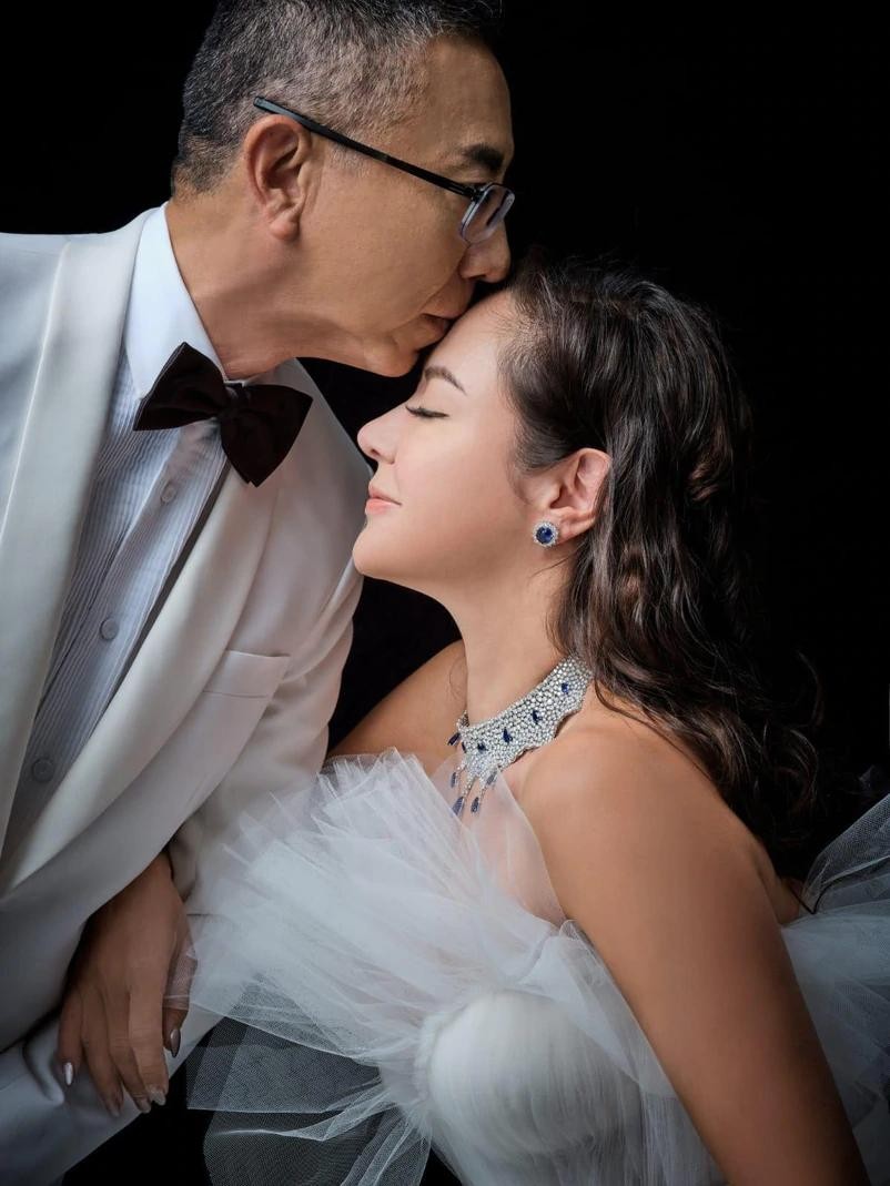 曝光的现场图中,63岁的新郎官身穿一袭白色帅气西装搭配黑色领结,戴着金丝边眼镜,帅气之余不失儒雅;50岁的新娘身穿白色透视婚纱,手拿捧花,十分幸福。只见一对新人站在结婚蛋糕面前,置身于洁白礼堂中,贴脸相拥在一起,画面无比温馨!