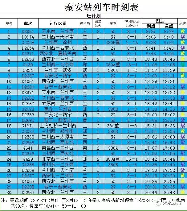2018年春运来临之际,铁道部对秦安县停靠车次又作了新的调整,1月17日,从秦安高铁站了解到,从1月20日开始,在秦安高铁站停靠的车次在原来的基础上新增7车次,分别为G2028兰州西—徐州、G430兰州西—北京西、G854兰州西—武汉、G2023商丘—兰州西、G1971上海虹桥—兰州西、G2022兰州西—郑州东、G429北京西—兰州西。同时在春运期间(从2018年2月1日至3月12日)还将开设由兰州西—广州南G842列车。