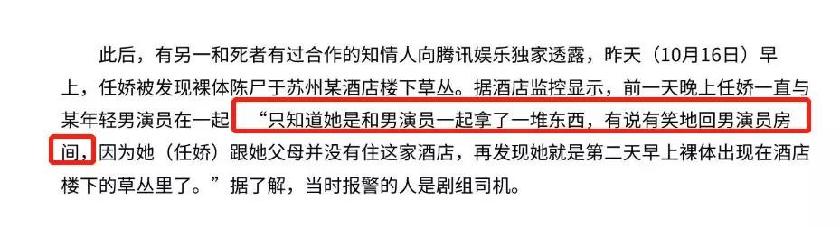 2017年,任娇在苏州某酒店突发坠楼身亡,根据当时现场报道,警察赶到现场时任娇“赤身裸体”在草丛之中,身上没有任何遮挡之物。