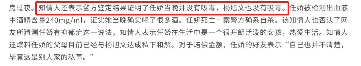 另一方面,有人透露出任娇是因为“吸d致幻”,并表示杨旭文也也存在同等行为,才让任娇不自主跳楼,然而警方也证明了任娇两人没有这种违法行为。