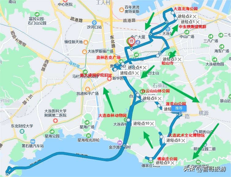 2、推荐西岗区景点自驾游行程路线:西岗区-中东铁路建筑群-大连北海公园-松山寺-大连奥林匹克广场-旅大建国学院旧址-白云山山体公园-莲花山公园-大连武术文化博物馆-傅家庄公园-大连森林动物园-西岗区。
