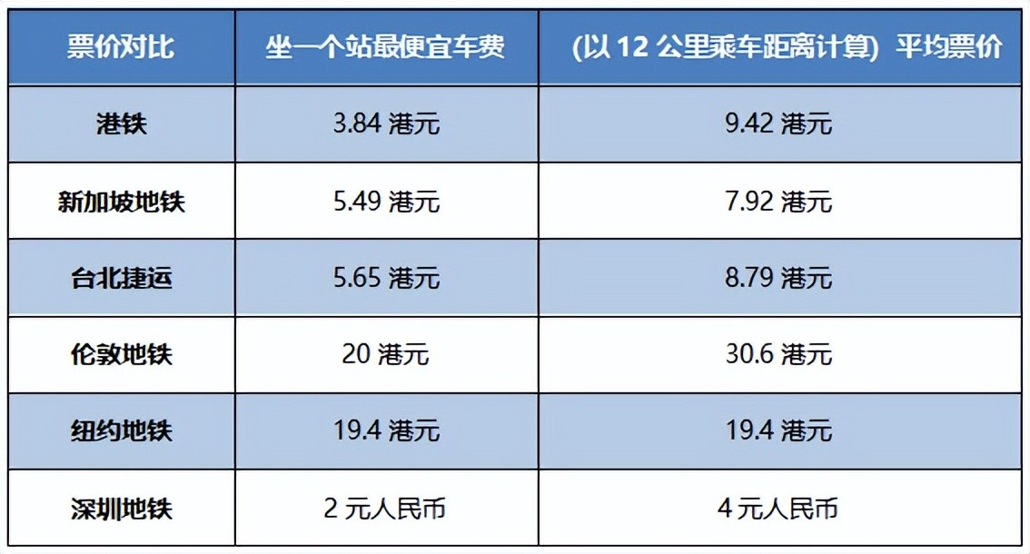 而放眼世界其他大城市来看,香港地铁的票价还算良心的。新加坡地铁坐一个站最便宜车费为5.49港元,台北捷运则要5.65港元。若以12公里的乘车距离计算,港铁平均票价为9.42港元,新加坡地铁7.92港元,台北捷运则是8.79港元。