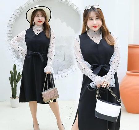 法式蝴蝶结假两件连衣裙,撞色设计,A字收腰下摆,木耳边小飞肩,领前蝴蝶结时尚个性,胖妹妹穿很显瘦哦!